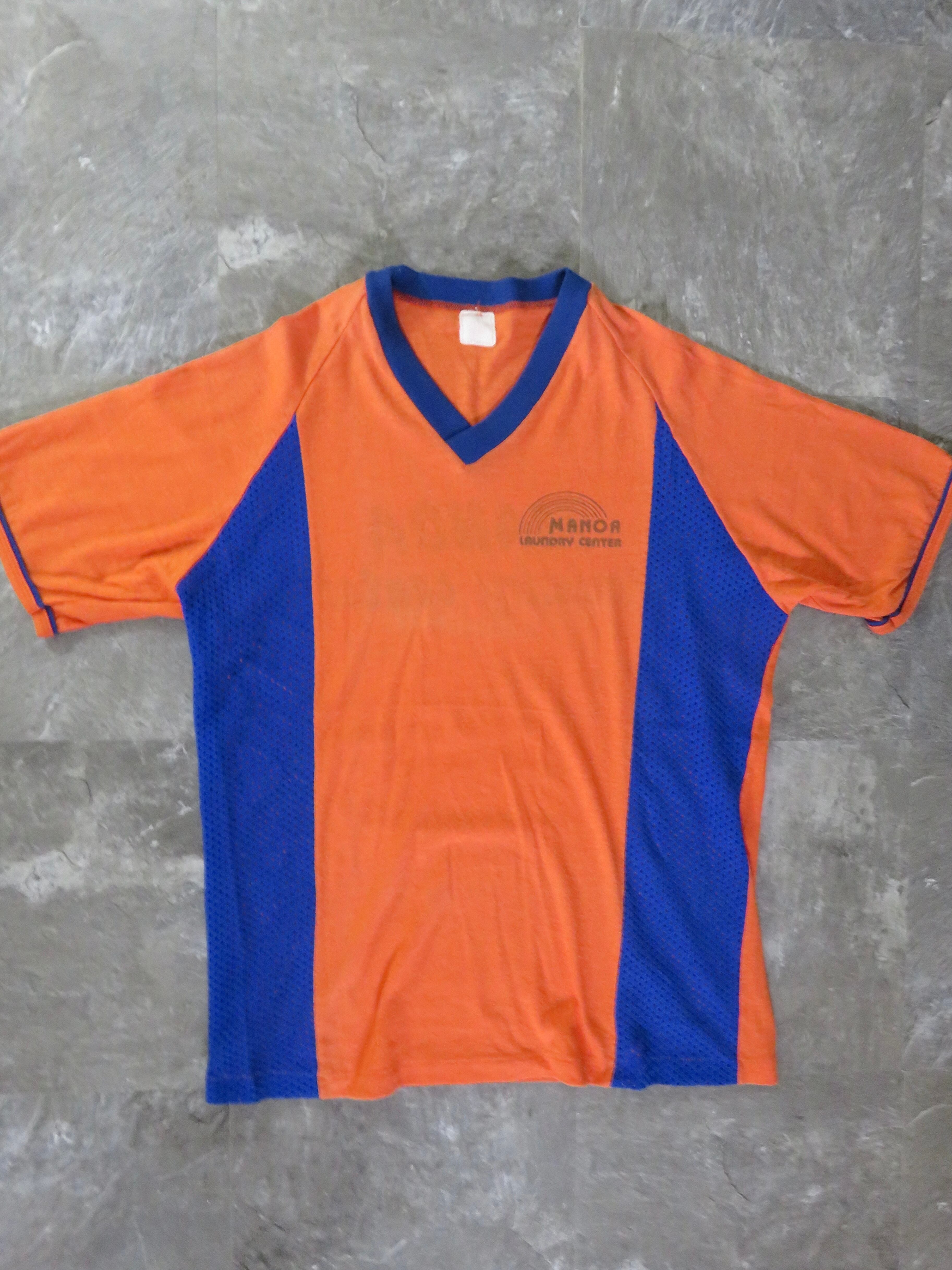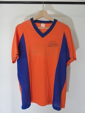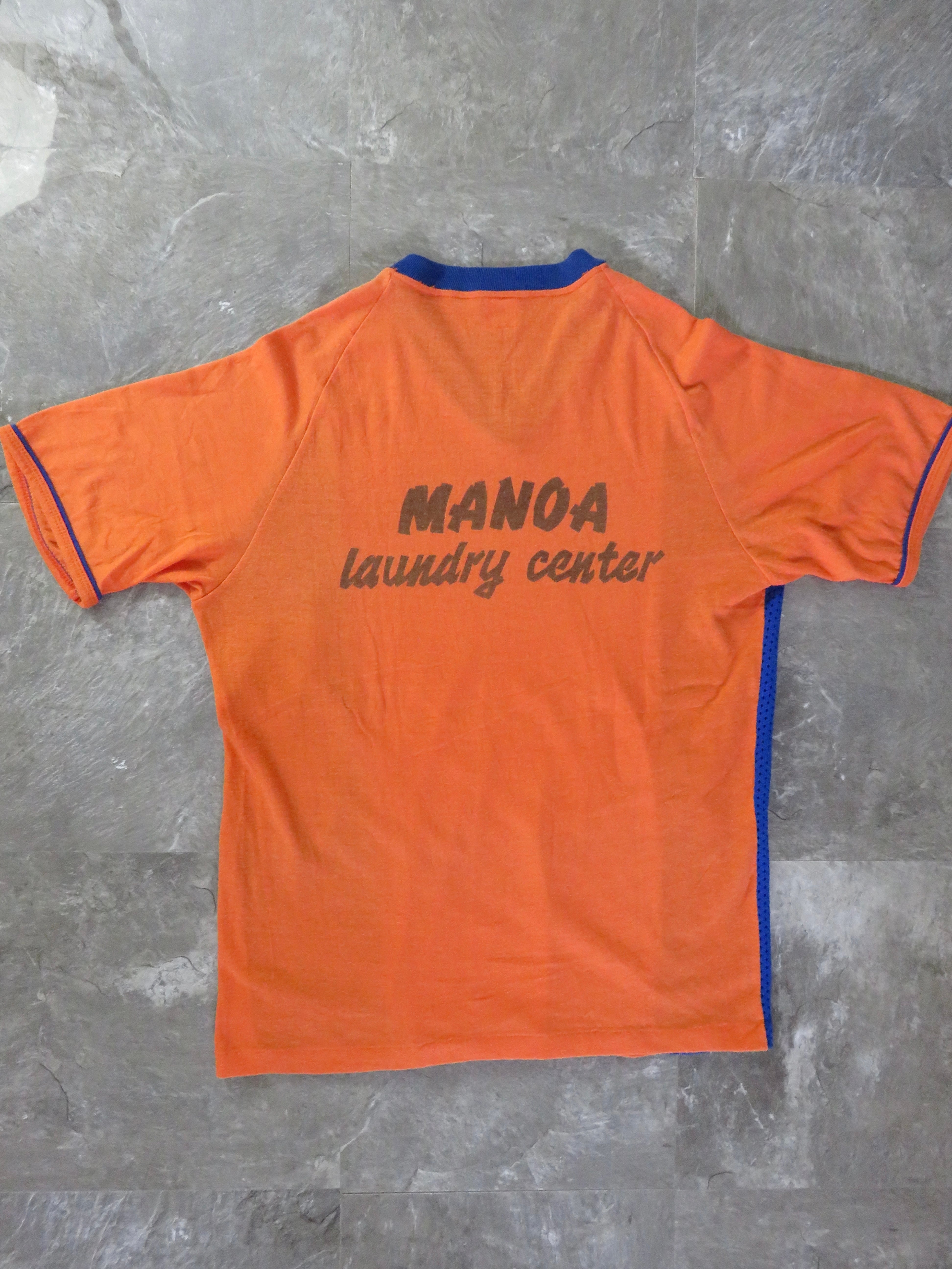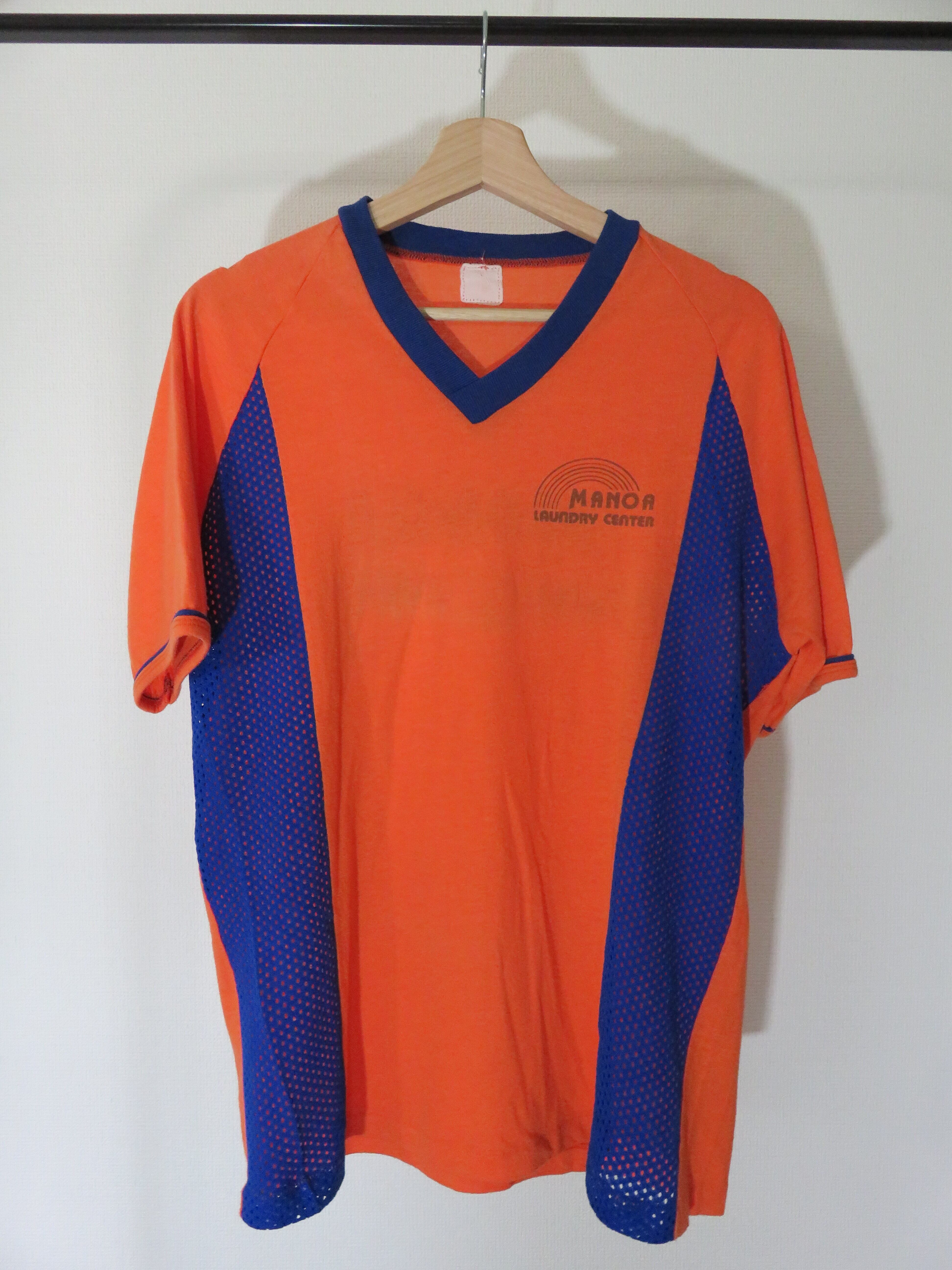 ハワイ州マノアから、ランドリーセンタースタッフのコスチューム。一見ゲームシャツのような風貌ですが、フロントの左胸あたりと後ろにランドリーセンターのプリントがあります。サイドがメッシュで通気性はもちろん、ボディーのオレンジとブルーのコントラストがファッションにも落とし込める素晴らしい1枚です。