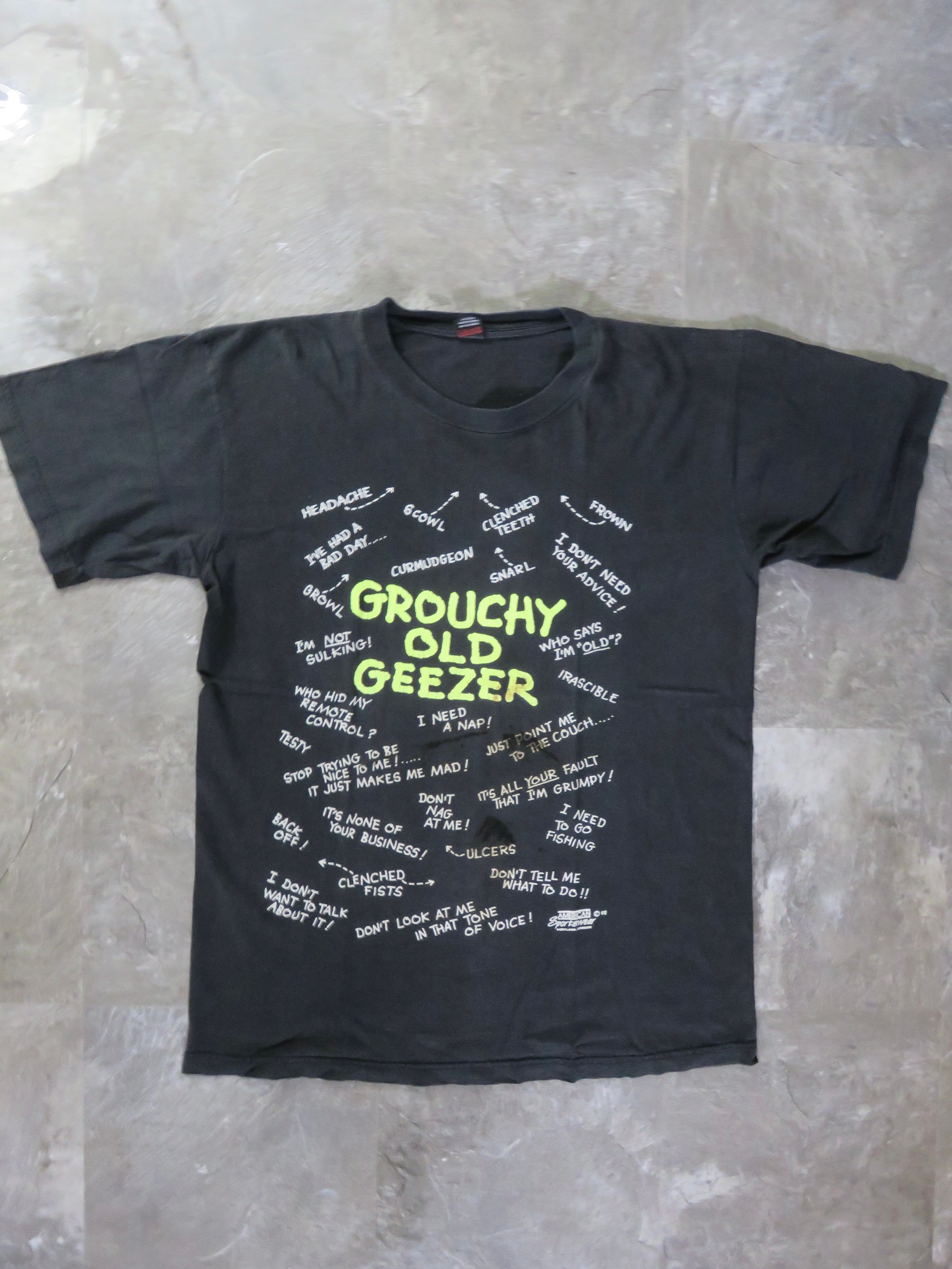 中心に「不機嫌そうな老人」と書かれ、その周りにはその老人が発言していそうな嘆きや、怒り、少しボケたような単語や言葉が散らばっていて、それが両面にプリントされております。