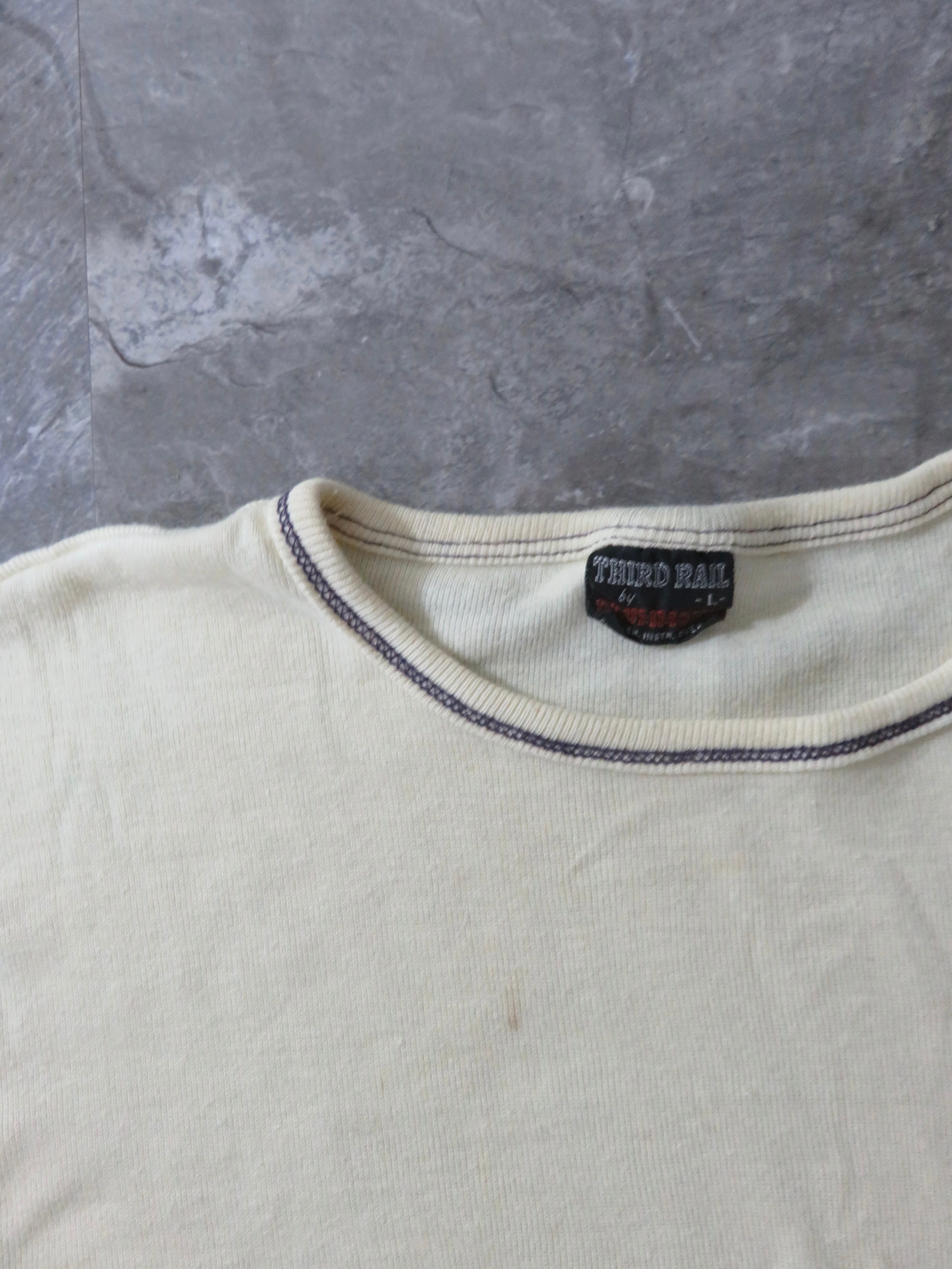 こちらはおそらくスポーツ、トレーニングなどに使われていたTシャツかと思います。ビンテージ感漂うボディーですが、両サイドにリバースが入っておりステッチがブルーでヴィンテージとの相性がもっぱら良さそうです。